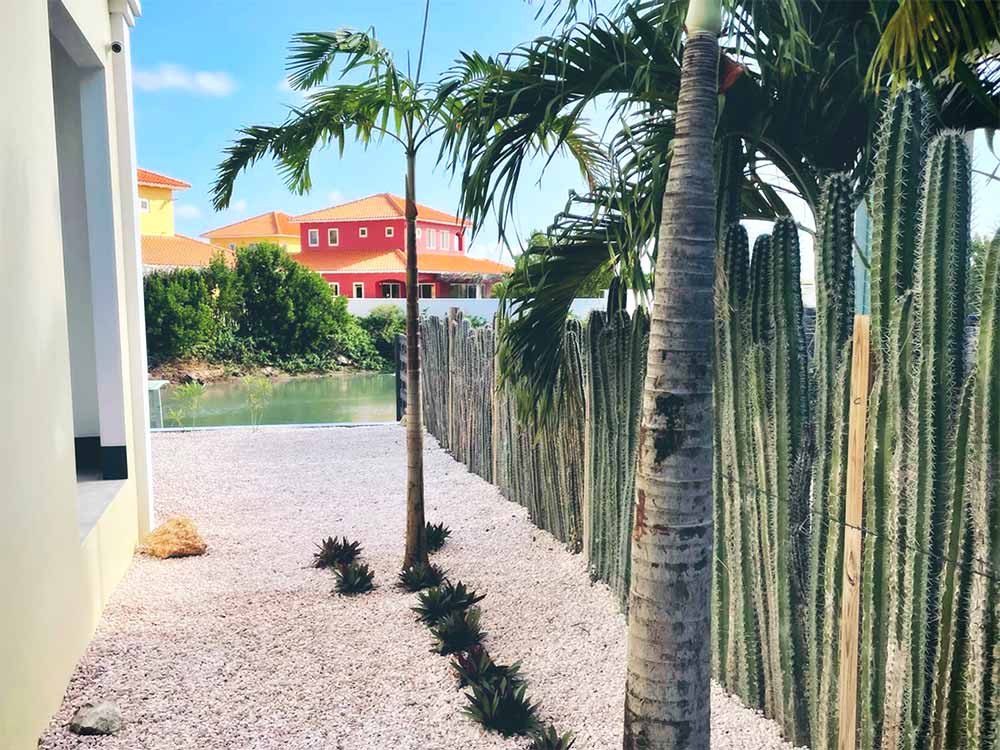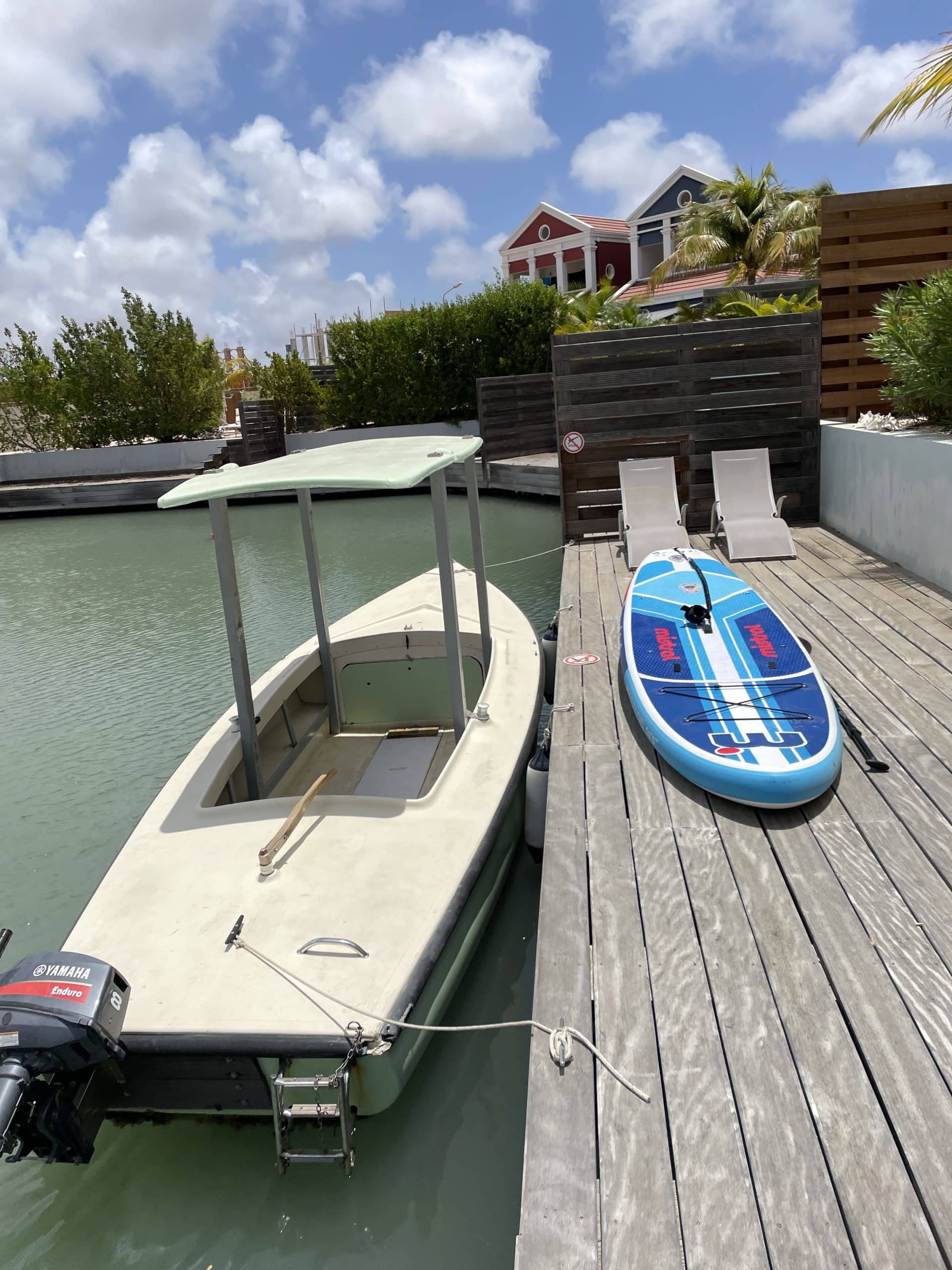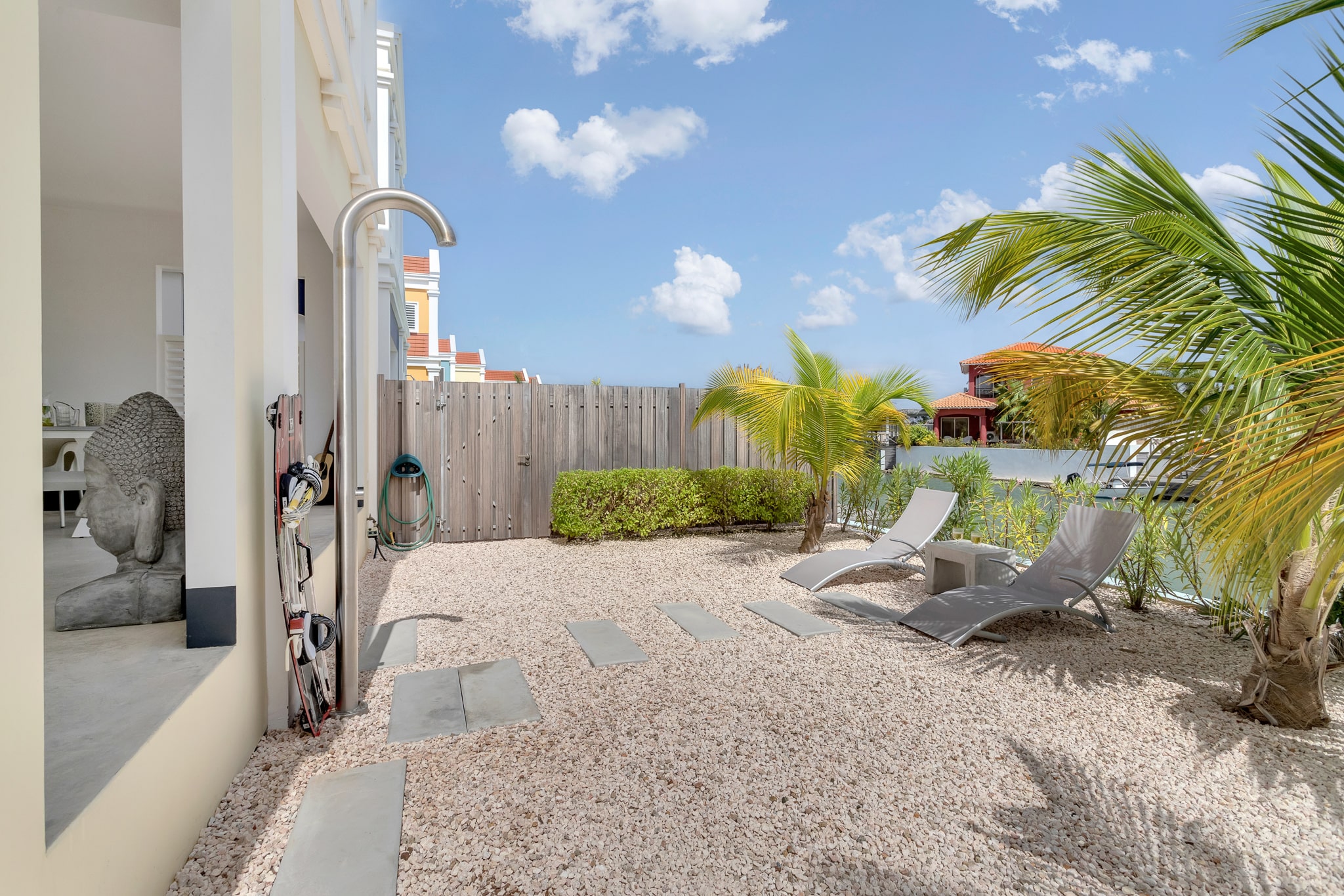 Heerlijk genieten in de eigen tuin met diverse palmbomen. De tuin grenst direct aan het water dat na enkele vaarminuten uitkomt op de zee. Door de ligging aan de lagoon is het altijd heerlijk vertoeven in de tuin of op de brede houten aanlegsteiger. In de tuin staan 2 loungestoelen en er is een buitendouche aanwezig