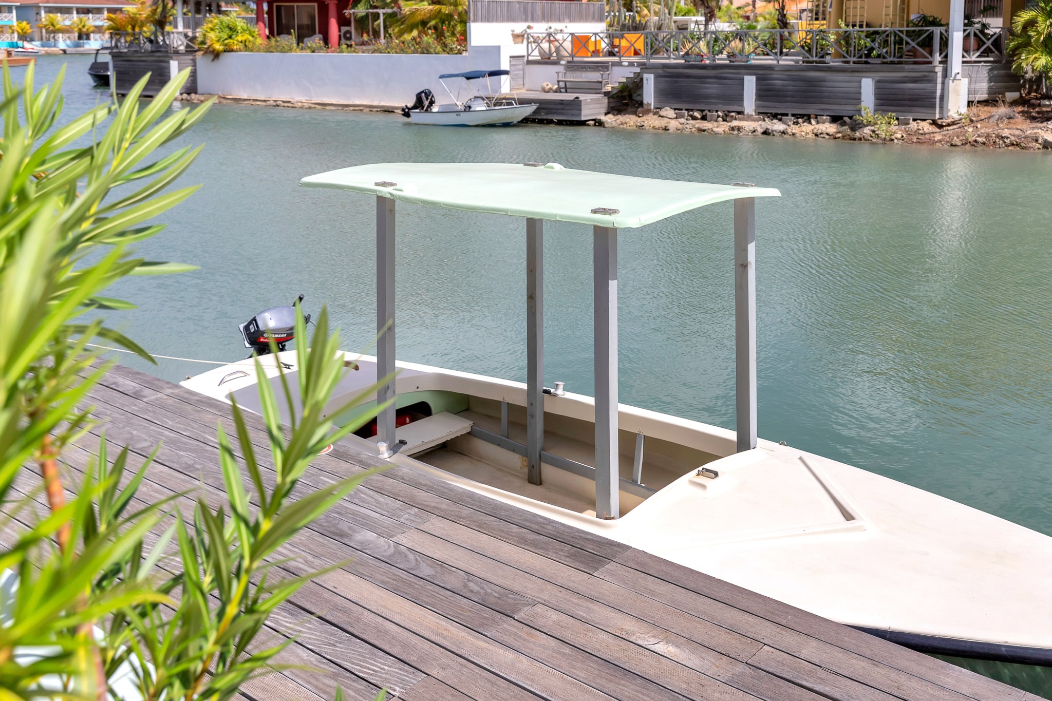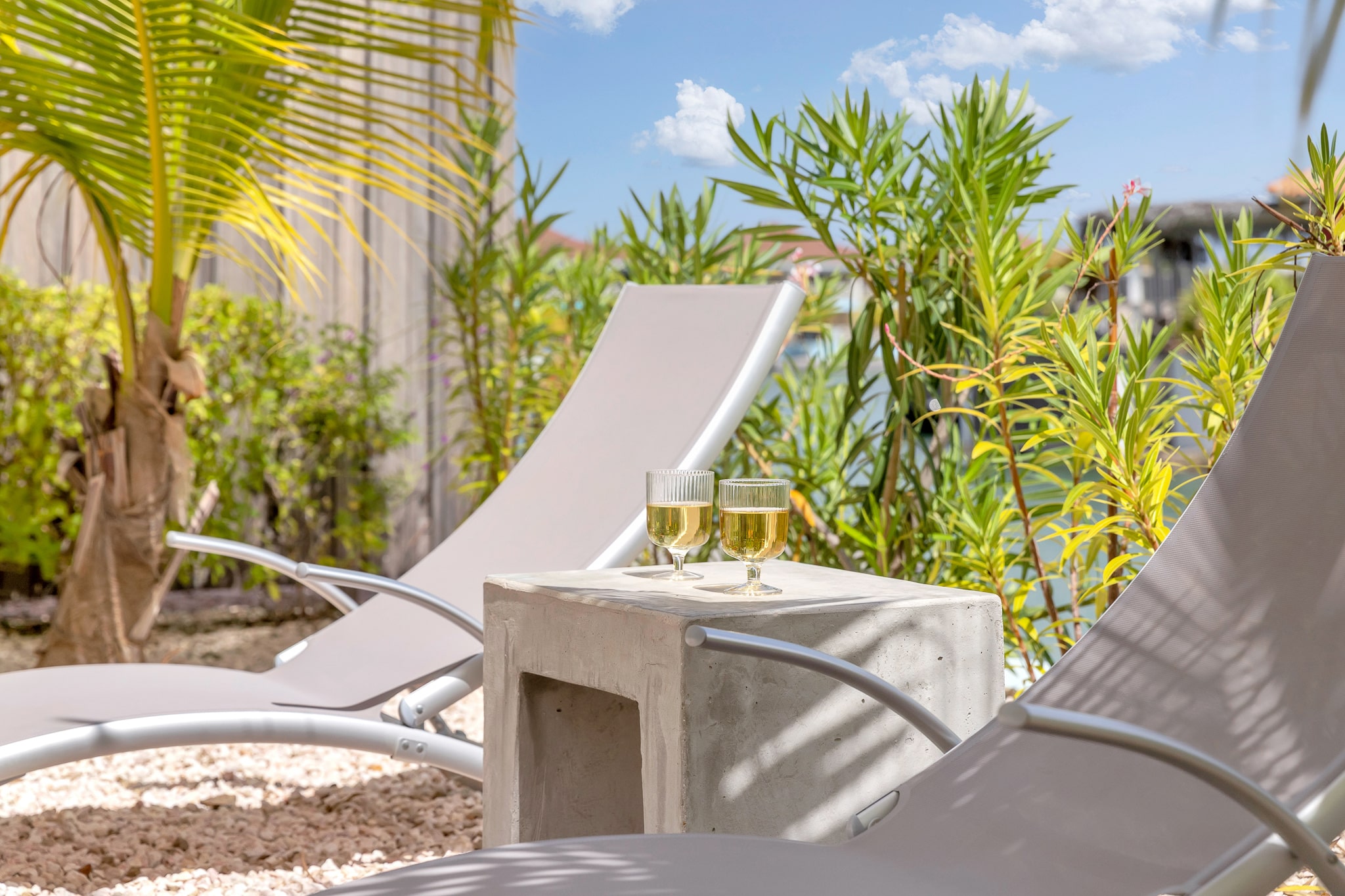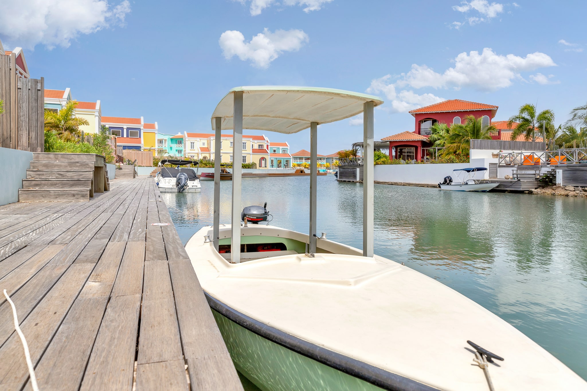 Heerlijk genieten in de eigen tuin met diverse palmbomen. De tuin grenst direct aan het water dat na enkele vaarminuten uitkomt op de zee. Door de ligging aan de lagoon is het altijd heerlijk vertoeven in de tuin of op de brede houten aanlegsteiger. In de tuin staan 2 loungestoelen en er is een buitendouche aanwezig