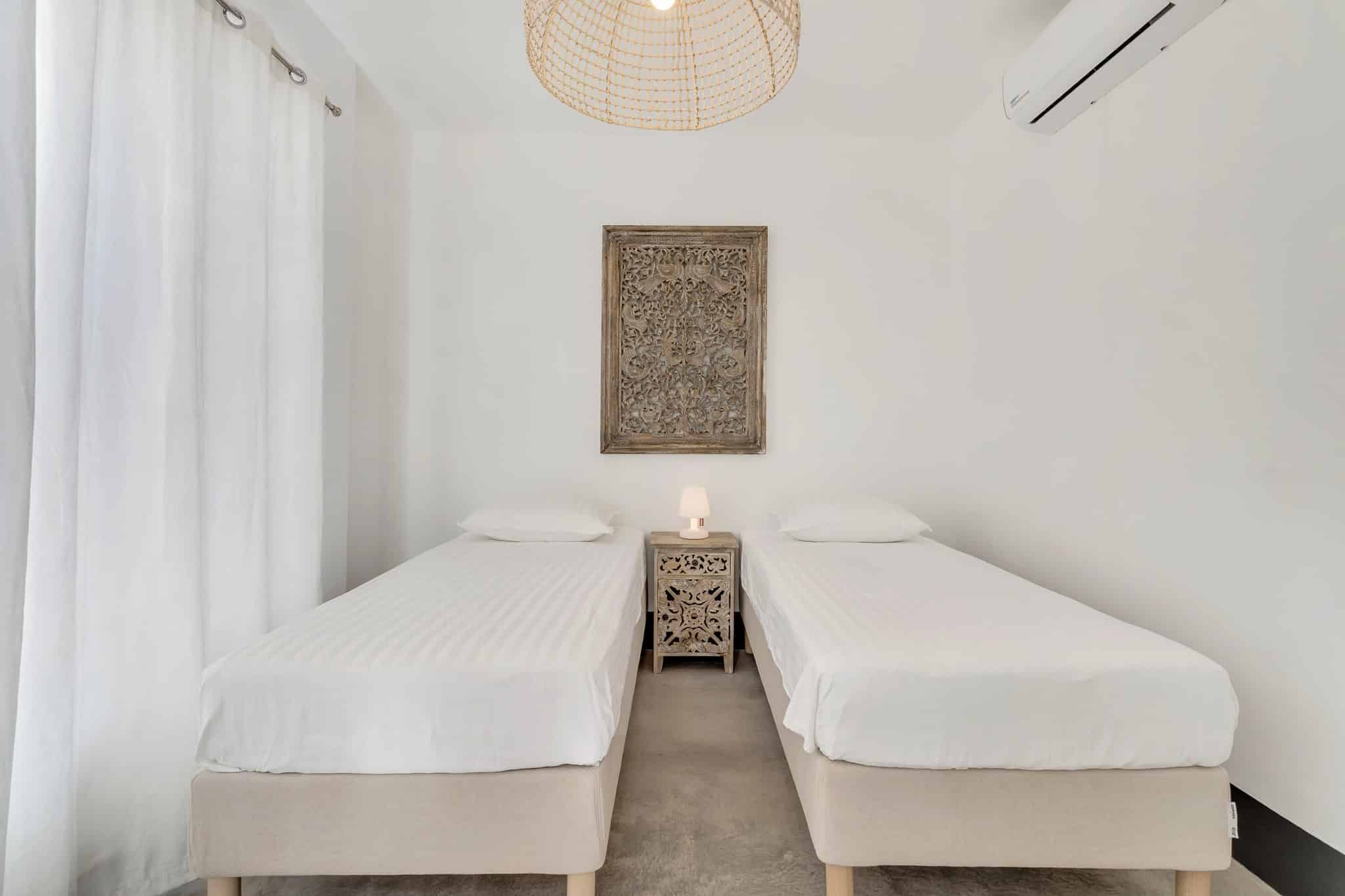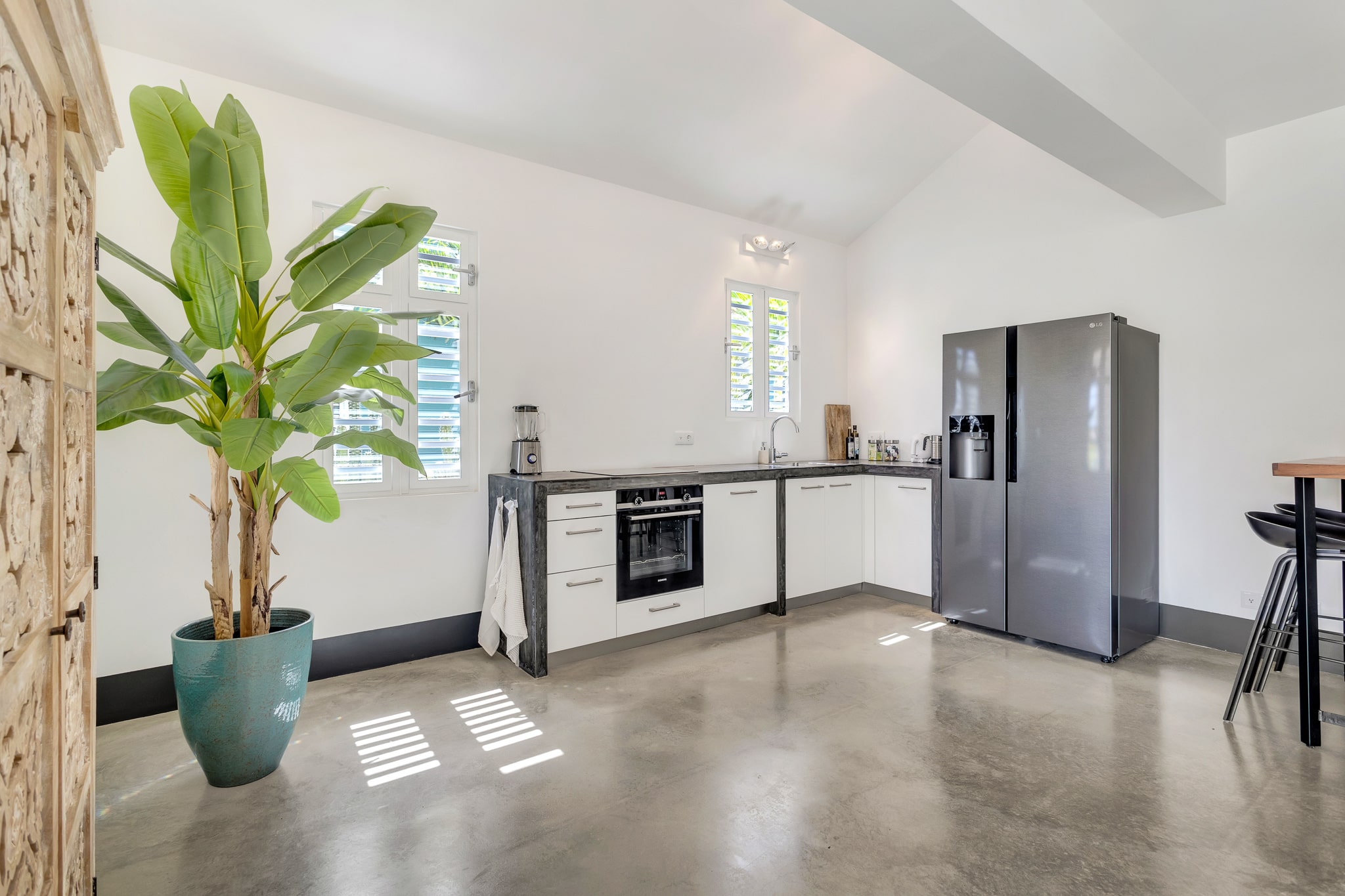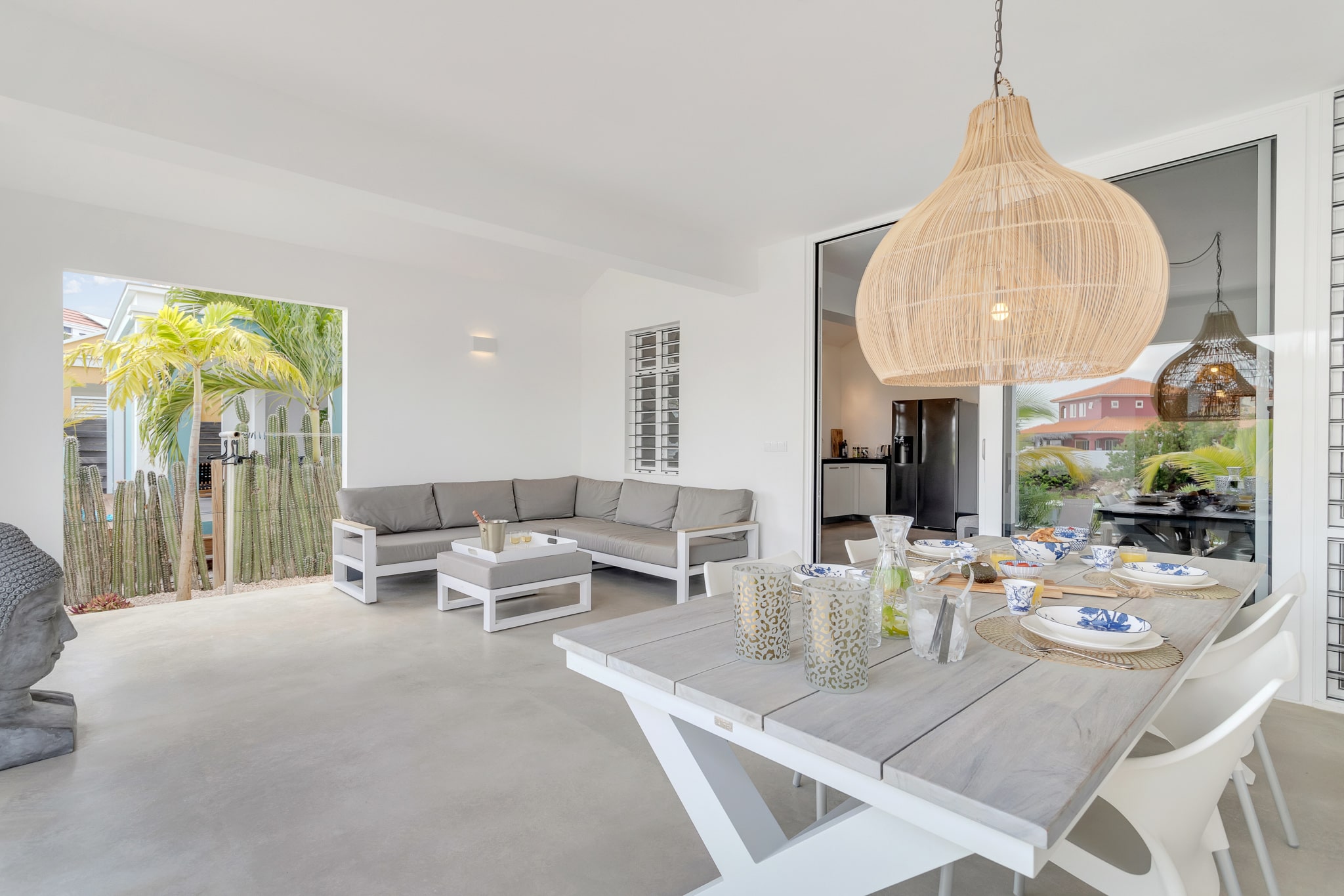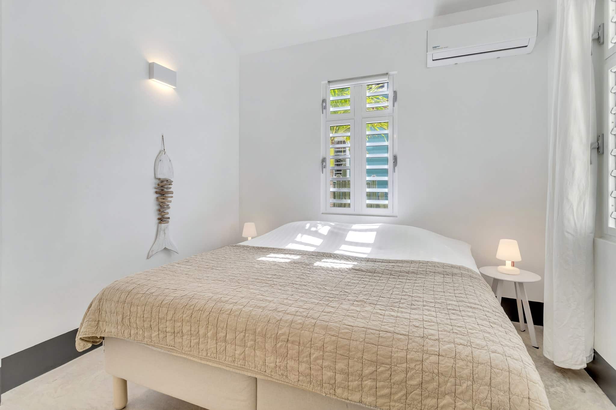 Alle ramen van de villa zijn glazen lamellen met daarachter een hor. Met één enkele handeling zet je de lamellen/ramen open. Hierdoor zorgt de caribische wind voor een continue natuurlijke ventilatie en koeling in de hele woning. De slaapkamers zijn voorzien van airconditioning en de woonkamer van een geruisloze ventilator mocht u ’s nachts toch extra verkoeling wensen