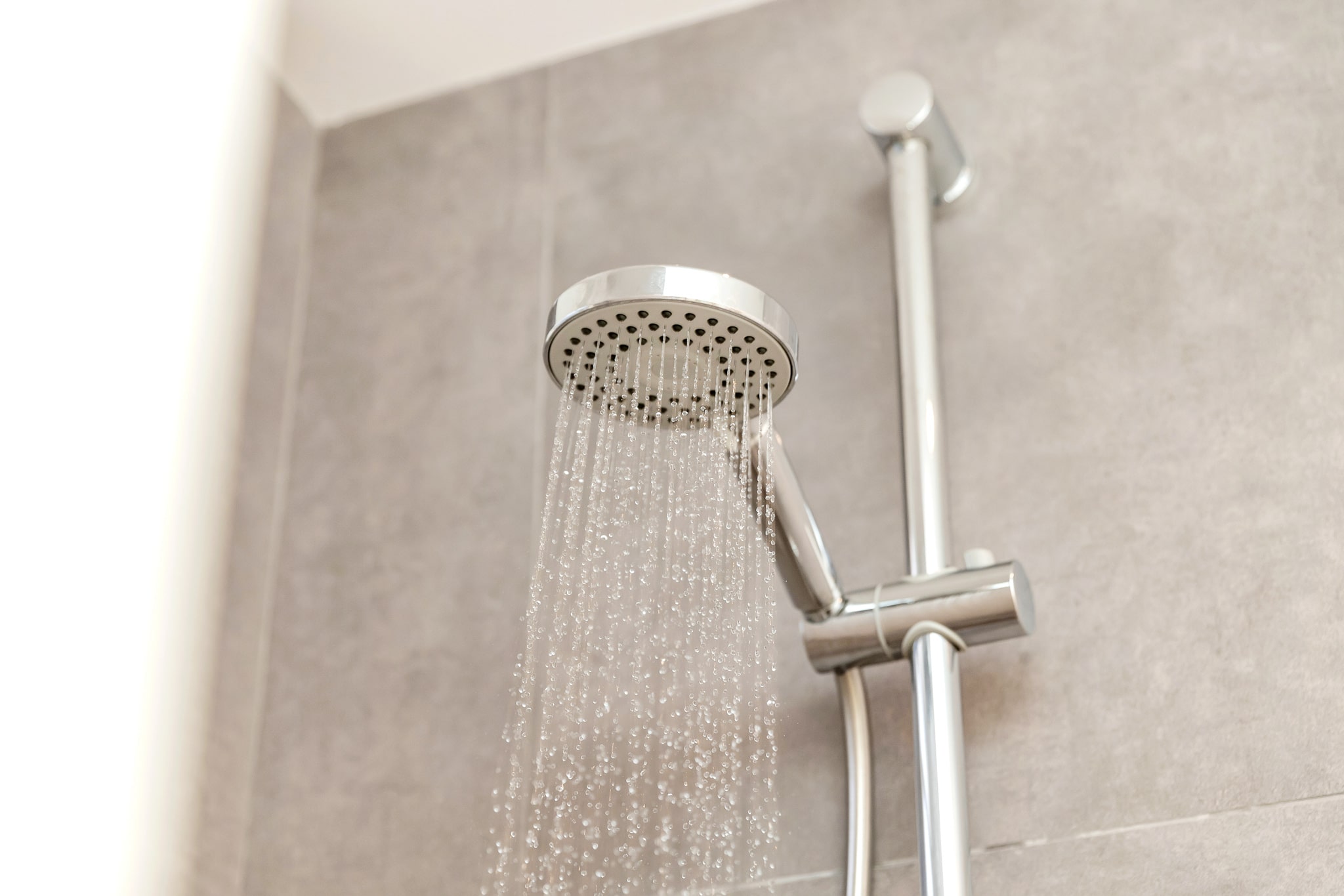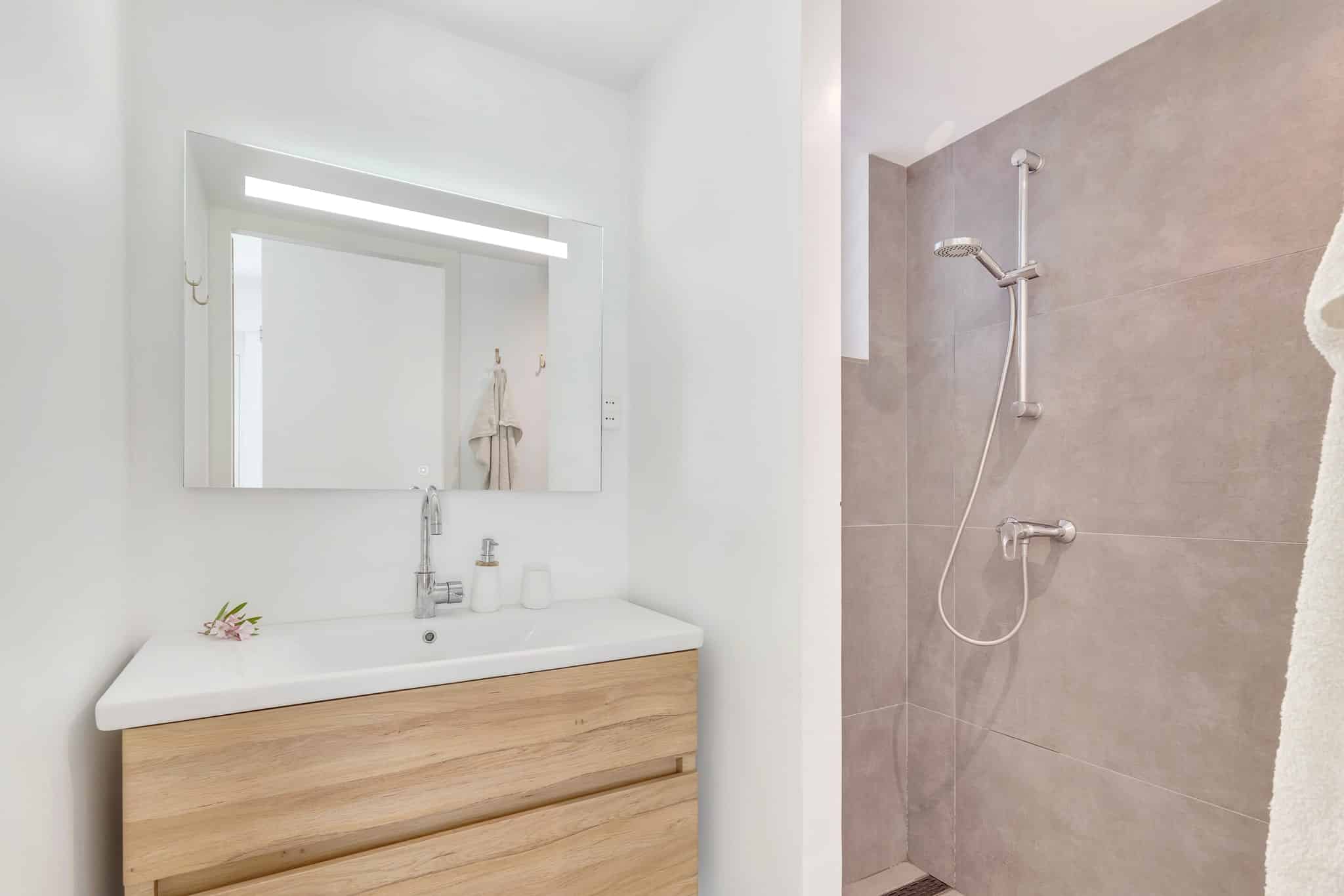 De badkamer is voorzien van een gietvloer, verstelbare douche, badmeubel met twee ruime lades, föhn en dubbel 220V stopcontact bij de wastafel
